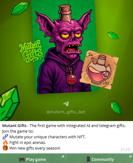 Mutant Gifts — это мини-игра в Telegram, которая маскирует монетизацию под подарки, мутации и сезоны и подает участие как развлечение, хотя в реальности она завязана на внутриигровые активы и постоянное стимулирование трат. Проект работает через бота Mutant Gifts (@mutant_gifts_bot), новости публикуются в паблике @mutant_gifts. Заявлено, что ежемесячная аудитория 12 532 пользователей. В интерфейсе прямо заявлена связка «ИИ и NFT подарки» и обещания «ценных наград на протяжении сезона».