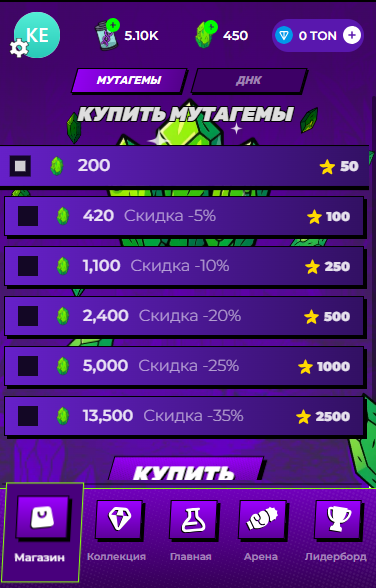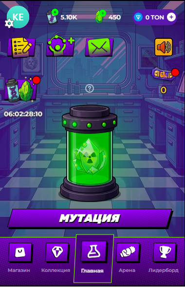 Изначально пользователь видит меню с ключевыми разделами: Магазин, Коллекция, Главная, Арена, Лидерборд, а центральная механика вынесена в отдельную вкладку Мутация. Логика построена вокруг цикла «получить ресурс, улучшить бойца, пойти в атаку, снова получить ресурс. На старте предлагается создать/выбрать персонажа, дальше игрок управляет составом бойцов и участвует в сражениях на арене.