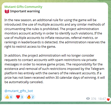 Последние новости в сообществе Mutant Gifts Community касаются введения правила по честной игре: администрация прямо запрещает использование мультиаккаунтов и любых обходных схем, которые дают игровое преимущество. Под запрет попадают действия, направленные на фарм ресурсов и искусственную накрутку показателей в рейтингах.