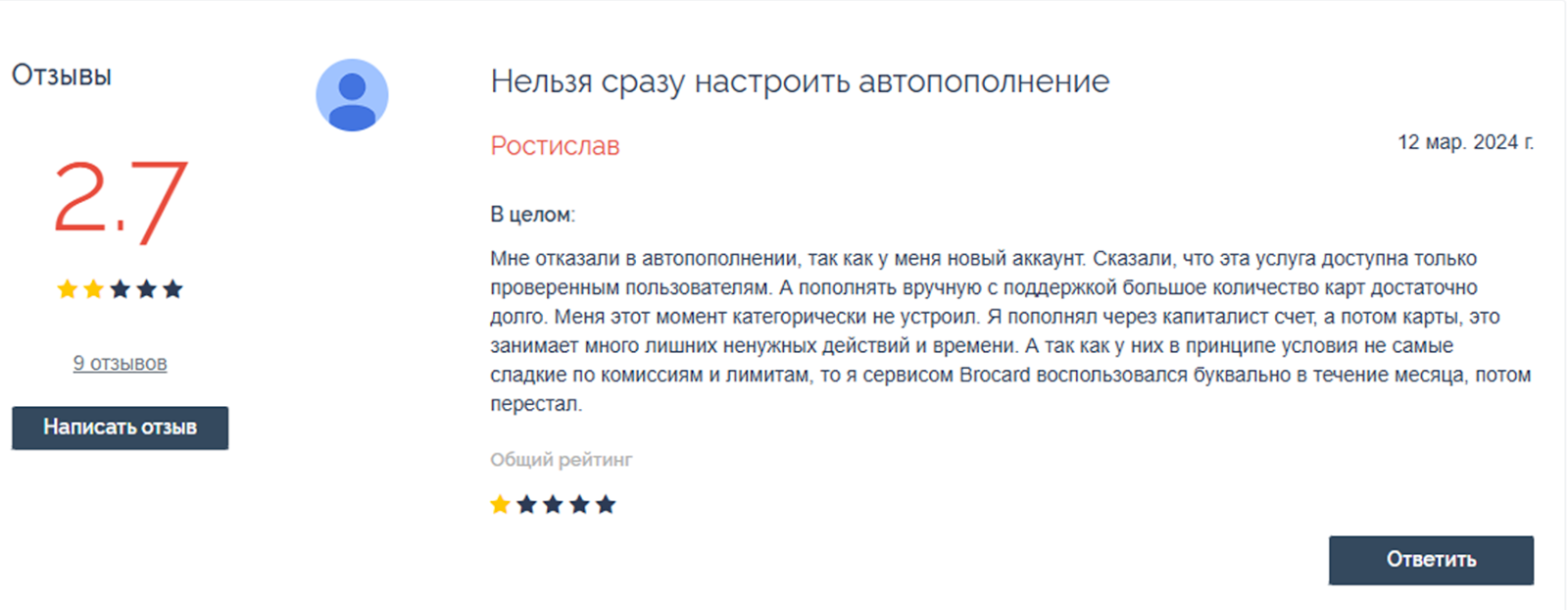 Несмотря на то, что проект работает довольно давно и успел получить определенную популярность, отзывы на Mybrocard далеко не самые лучшие. Многие клиенты сервиса отмечают высокие комиссии, слишком долгое одобрение для получения карты, блокировки и сбои при совершении платежей.