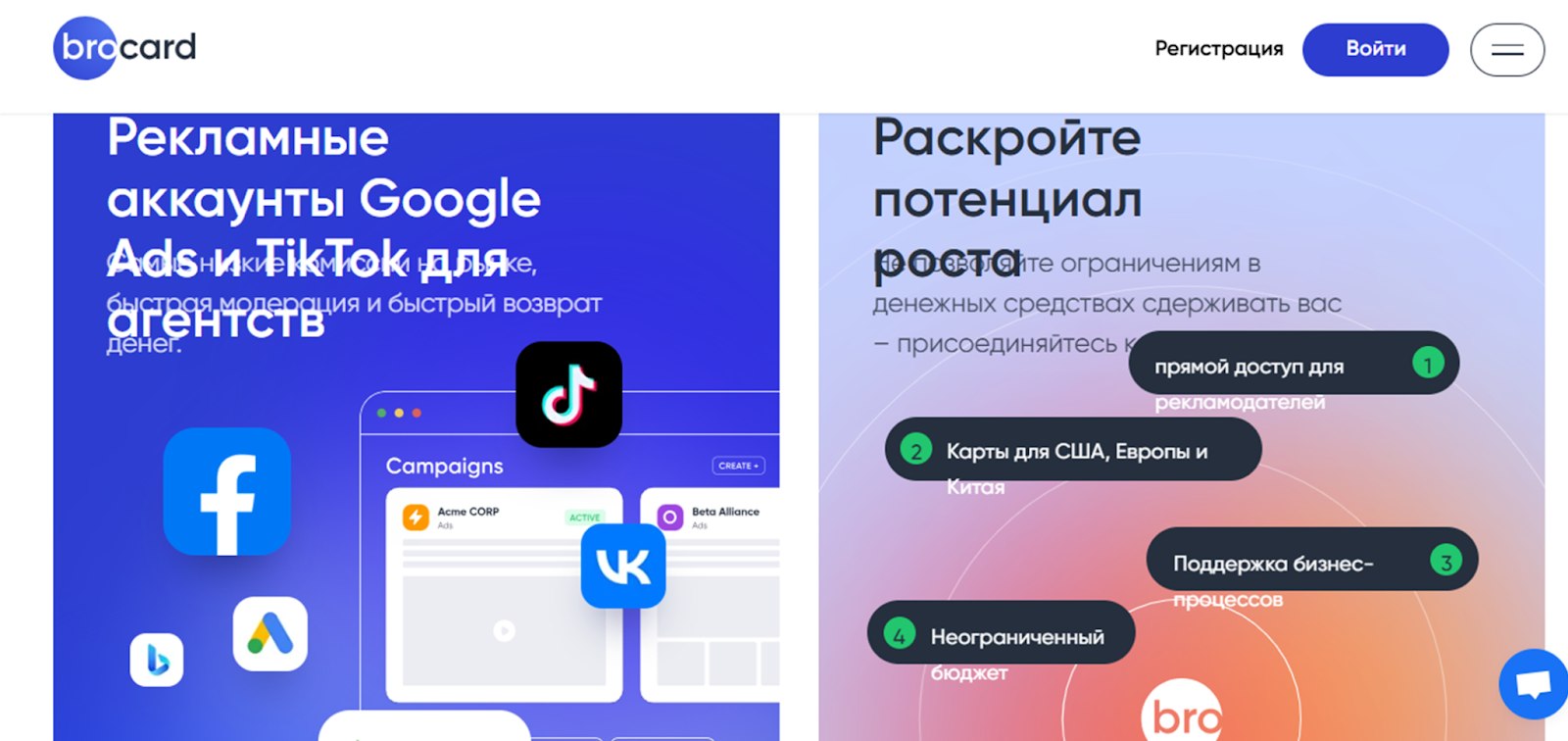 Проект сотрудничает как с частными клиентами, так и с командами и юридическими организациями. Предлагает услуги для арбитража трафика. Благодаря картам от Mybrocard пользователи могут продвигать свои аккаунты в социальных сетях, совершать покупки онлайн в заграничных магазинах, оплачивать подписки и совершать международные переводы.