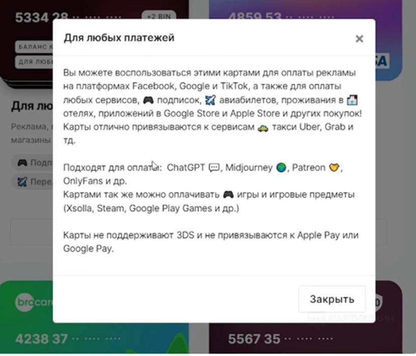 На Mybrocard com частные и корпоративные клиенты могут заказать выпуск виртуальных карт, которые легко привязать к любым соцсетям и заграничным сервисам. С них можно оплачивать любые подписки, услуги, оплачивать VPN, доступ к нейросетям и т.п.