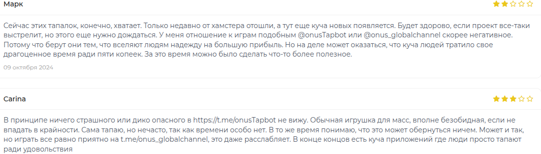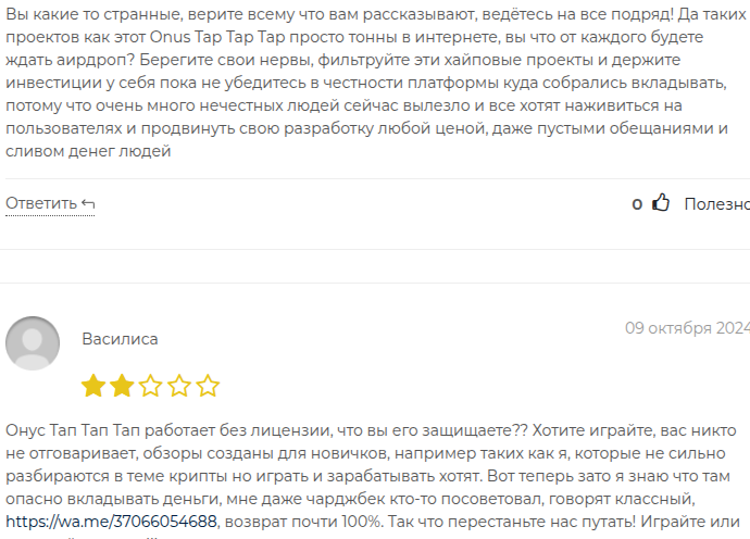 Пользователи отмечают, что тапалка Onus Tap Tap Tap не является эффективным средством для заработка. Также фармеры утверждают про анонимность разработчиков.