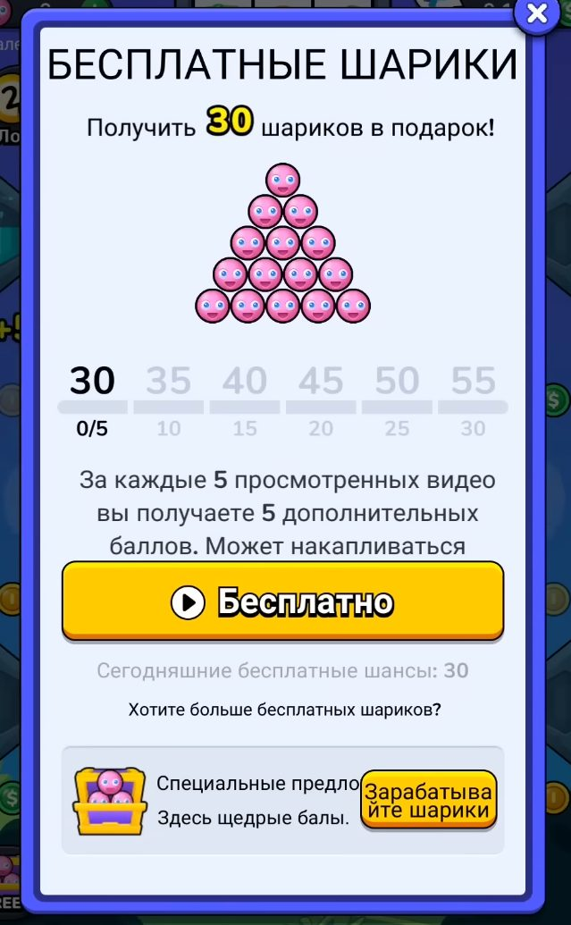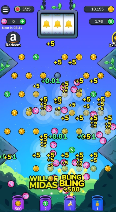 Внутри игры, кроме основного поля Plinko, присутствуют дополнительные мини-игры. Все это тоже требует просмотра рекламы. Валюта в игре делится на два баланса: золотые монеты и доллары.