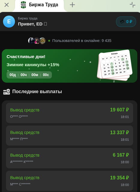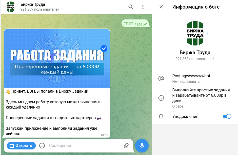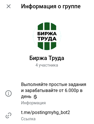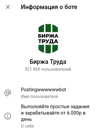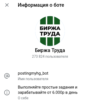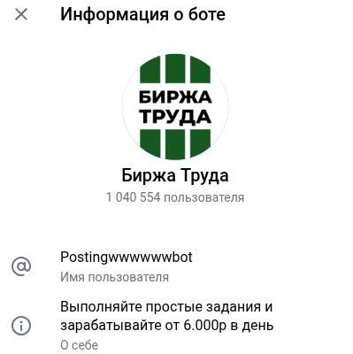 Postingwwwwwwbot — ТГ-бот Биржа Труда, клон многих других аналогичных, предлагающих якобы простые задания, которых можно зарабатывать от 6 000 рублей в день. Звучит многообещающе, но никаких доказательств таким заработкам нет.