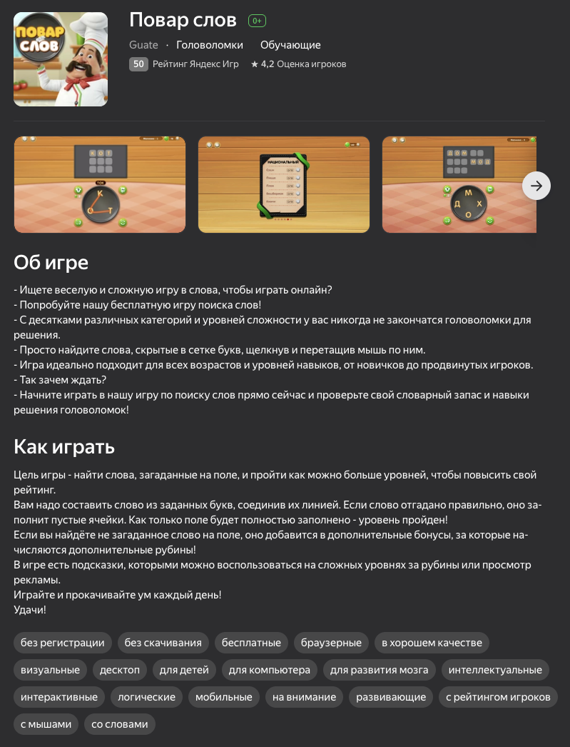 «Повар слов» — игра, которая доступна в виде приложения для Android, и веб-аппликации на сервисе Yandex Games. Жанр развлечения — головоломка.