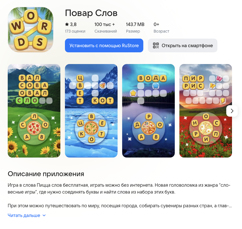 «Повар слов» — игра в формате мобильного и веб-приложения. Доступна в RuStore и на сервисе Yandex Games.