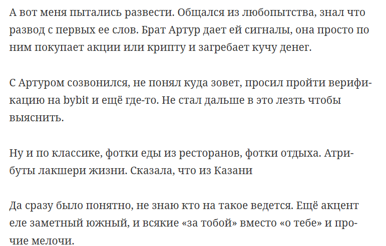 Потом она аккуратно переводит разговор. Предлагает помочь разобраться с заработком. Дальше начинается легенда про брата Артура. Он дает ей торговые сигналы на акции и крипту. Она покупает по его советам и якобы зарабатывает кучу денег. Никаких особых знаний не требуется – просто следуй сигналам.