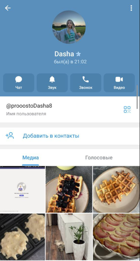 Аккаунт prooostodasha8 выглядит как страница обычной девушки. На аватаре фото на природе. В медиа раздел забит картинками с едой. Вафли с черникой. Выпечка с яблоками. Растение в горшке.