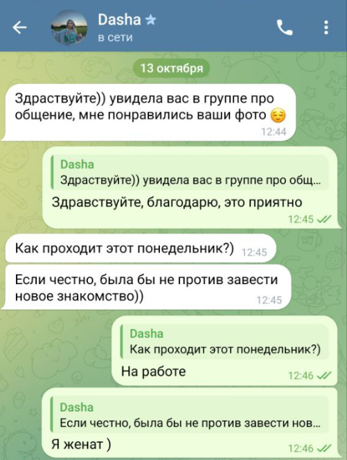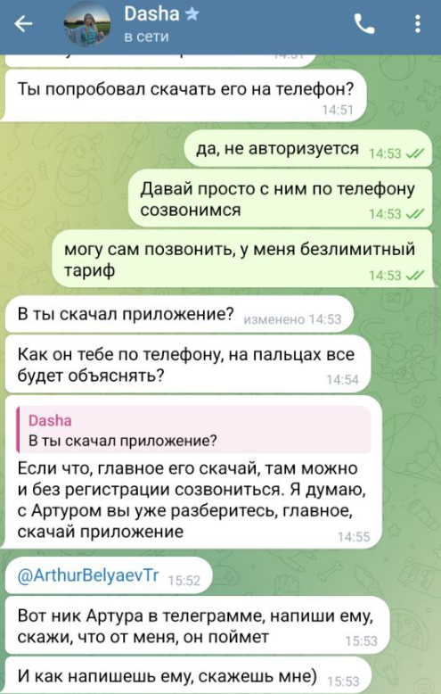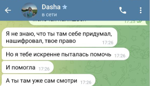 Мужчина общался с Dasha из любопытства. Он понял, что это развод, с первых сообщений. Созвонился с Артуром, но так и не разобрался в предложении. Пользователь решил не продолжать эксперимент.
