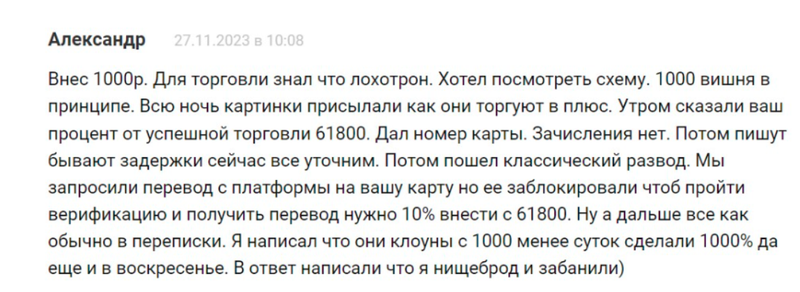 Риски очевидны: вы отправляете деньги частному лицу, не видите никаких гарантий, не получаете подтверждений реальной торговли и полностью зависите от доброй воли человека, о котором в сети собраны десятки жалоб.