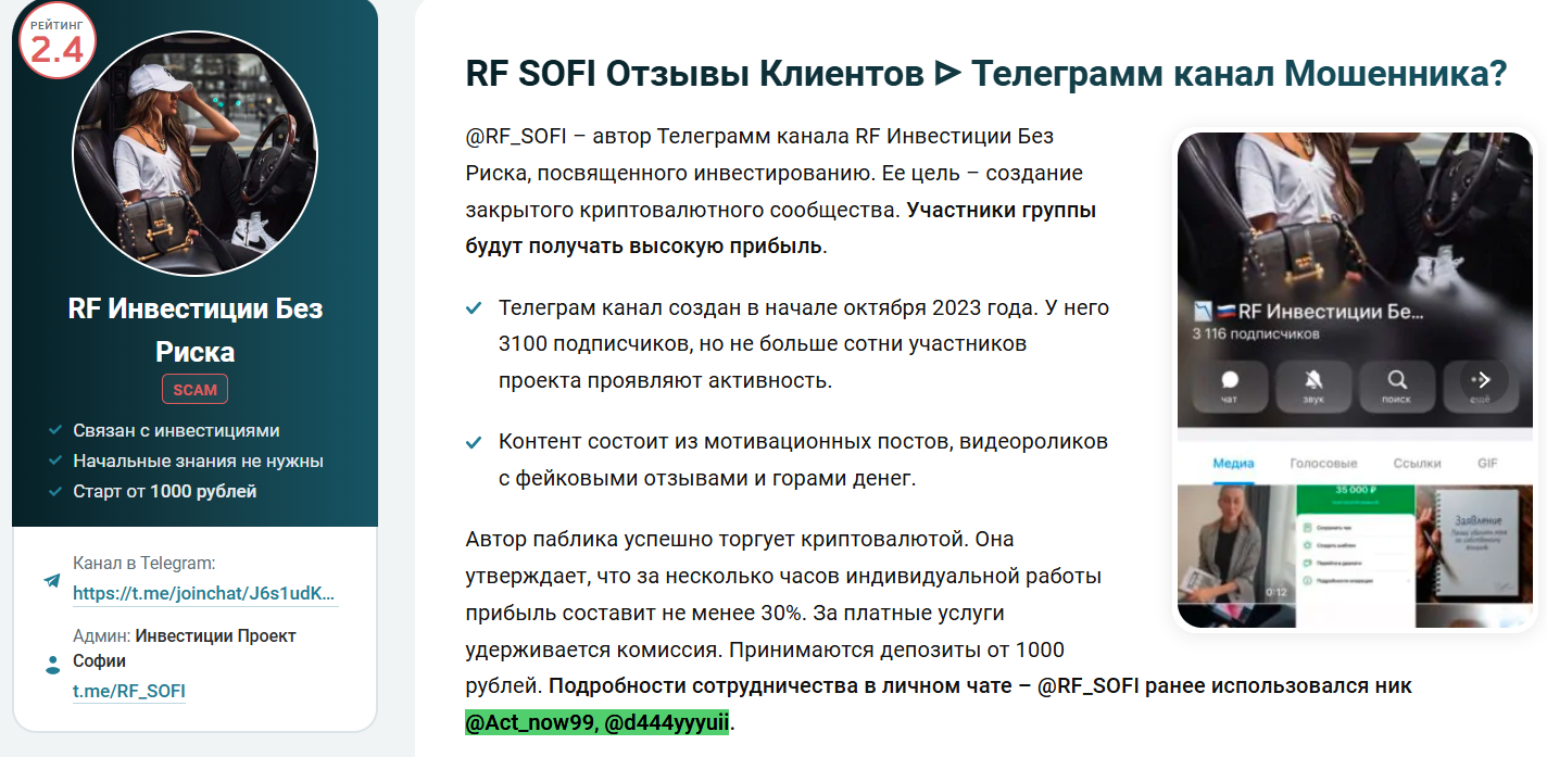 Это подается через истории успешных клиентов, где за ночь из 4000 рублей вырастает 70К, а из 500 — 35К. Клиента подталкивают начать с малого, а затем увеличить вклад, чтобы заработать еще больше.Все расчеты происходят лично с админом через ее ник @Рф Софи который, согласно ряду обзоров, ранее был другим: @Act now99 и @d444yyyuii. Это тревожный признак, поскольку смена нескольких ников подряд, частая практика мошенников, которые стирают следы старых жалоб.