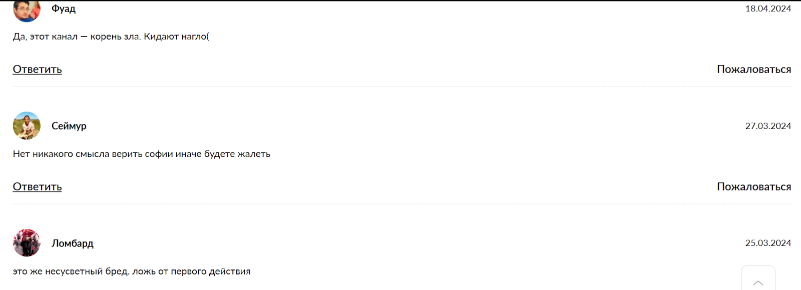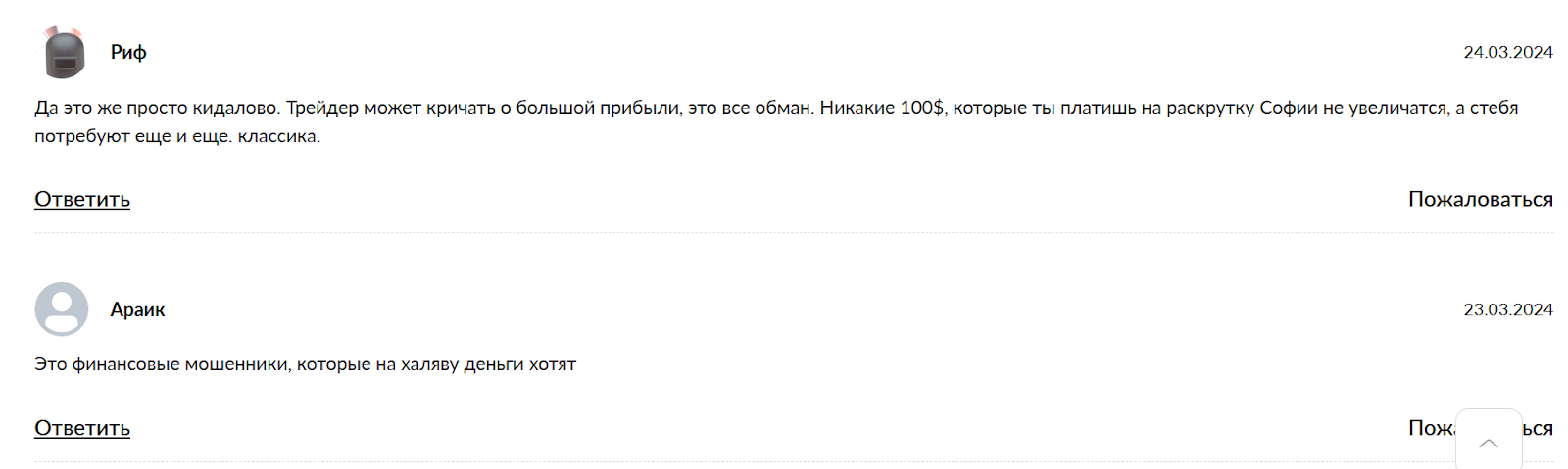 В сети о Софии много негативных историй. Люди пишут о том, что вся схема это ложь и финансовое мошенничество.