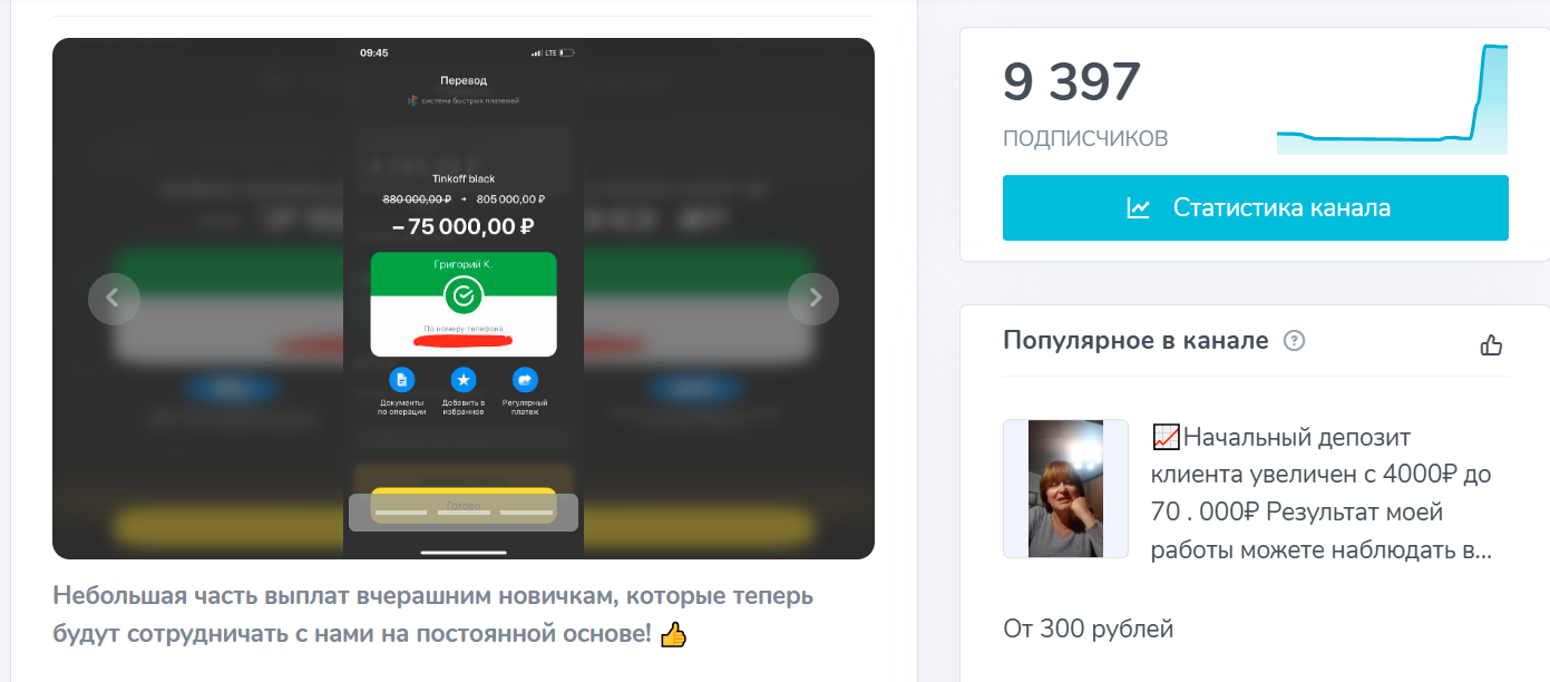 Сама схема подается под видом инвестиционной торговли или совместных сделок, где клиент якобы отправляет небольшой депозит — от 300 рублей, как указано в канале, а София раскручивает его за счет профессиональной торговли и возвращает сумму с прибылью.