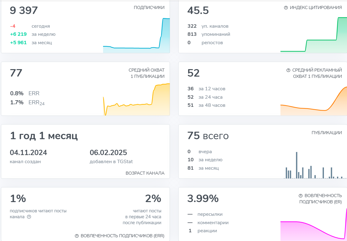 Несмотря на внушительную цифру подписок, вовлеченность низкая: около 1% аудитории читает посты, просмотры держатся около 36–52 за 24 часа, а ERR едва превышает 0,8%–1,7%.