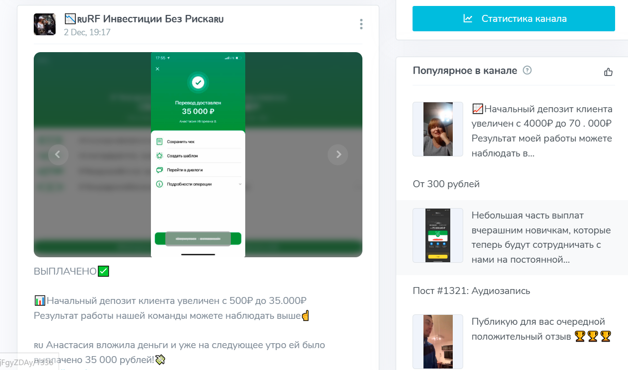 В ленте каждый день заявления о том, что депозит клиента вырос с 3000 до 70К, с 4000 до 185К, с 500 до 35К и все это на “честной торговле”, с мгновенными выплатами на карту любого банка. Канал обещает отсутствие рисков, прозрачность, честность, бесконечные доказательства, и уверяет, что достаточно одного шага, чтобы жизнь изменилась.