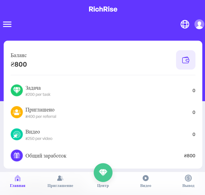 - Домой. Здесь приводится размер потенциального заработка и текущий баланс. Указывается, на какую сумму выполнено заданий, приглашено пользователей и просмотрено видео. Также указывается общий доход.