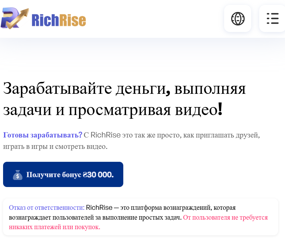 В одном из первых сообщений клиентам Рич Райс в Телеграм приводят отказ от ответственности. Здесь говорится, что данная платформа ориентирована на предоставление вознаграждений. Она дает деньги пользователям и не требует каких-либо покупок.