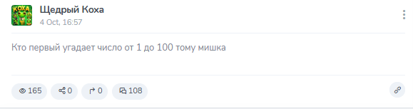 Постоянно анонсируются розыгрыши. Призы – виртуальные предметы типа мишек, букетов, алмазов, NFT. Условия элементарные. Написать комментарий под постом. Поставить нужную реакцию. Угадать загаданное число от 1 до 100. Все конкурсы построены на простейших механиках.