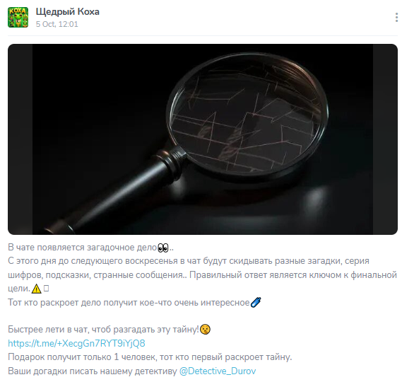 Четвертый формат – командные квесты и детективные игры. В чате запускают загадки, которые нужно разгадать первым. Победитель забирает крупный приз. Такие активности анонсируются заранее и растягиваются на несколько дней.