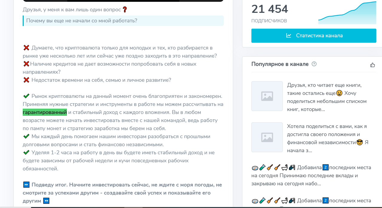 Все вопросы по переводам и реквизитам переводят в личные сообщения. Часто такие проекты покупают готовые каналы с подписчиками, чистят старую историю и наполняют новый контент “инвестиционными идеями”, чтобы создать видимость успешности.