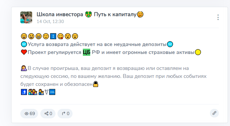 Создатели проекта “Школа Инвестора Путь к Капиталу” утверждают, что работают с Центральным банком, имеют “огромные страховые активы” и регулируются “государственным реестром”.На деле это полный вымысел — ЦБ такими вещами не занимается и не работает с частными ТГ-проектами. Подобные заявления просто звучат солидно и нужны, чтобы вызвать доверие у тех, кто не разбирается в теме.