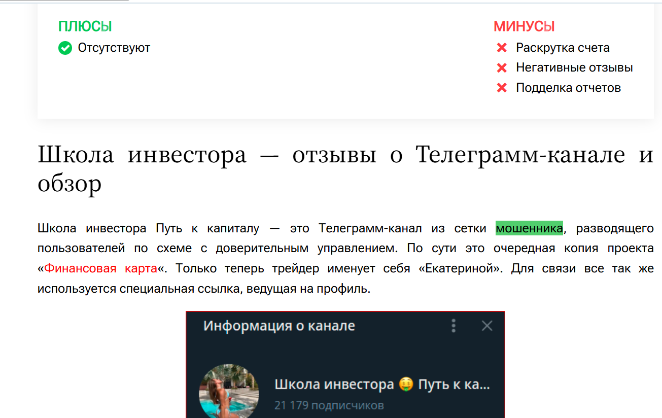 О канале “Школа Инвестора Путь к Капиталу” (Екатерина) отзывы в независимых источниках отсутствуют. Откликов о канале с этим названием мы не нашли, но это не удивительно. Подобные проекты постоянно меняют название, они регулярно появляются и исчезают в телеграмм.