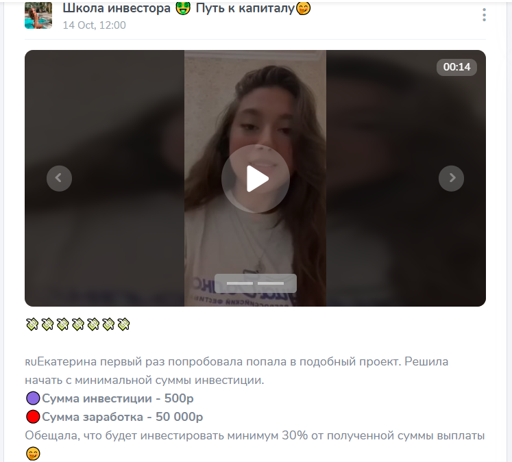 Контент канала строится вокруг трех тем: эмоциональная мотивация, истории успеха и постоянные наборы на инвестирование. В ленте публикуются короткие ролики и сообщения о неких “Екатеринах, Юлиях, Александрах”, которые якобы из долговой ямы выбрались благодаря вкладам в проект и теперь еженедельно удваивают капитал. Никаких реальных скриншотов, подтверждений выплат или публичных комментариев этих людей нет — только текст от имени автора канала.
