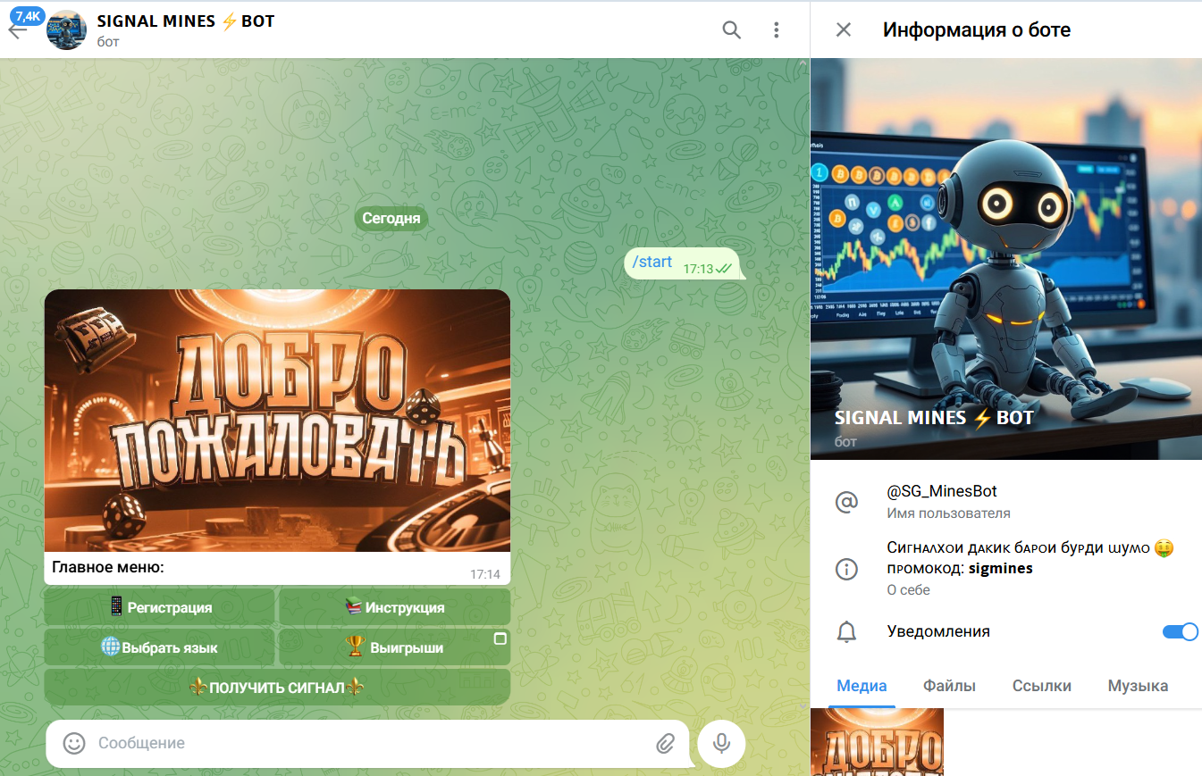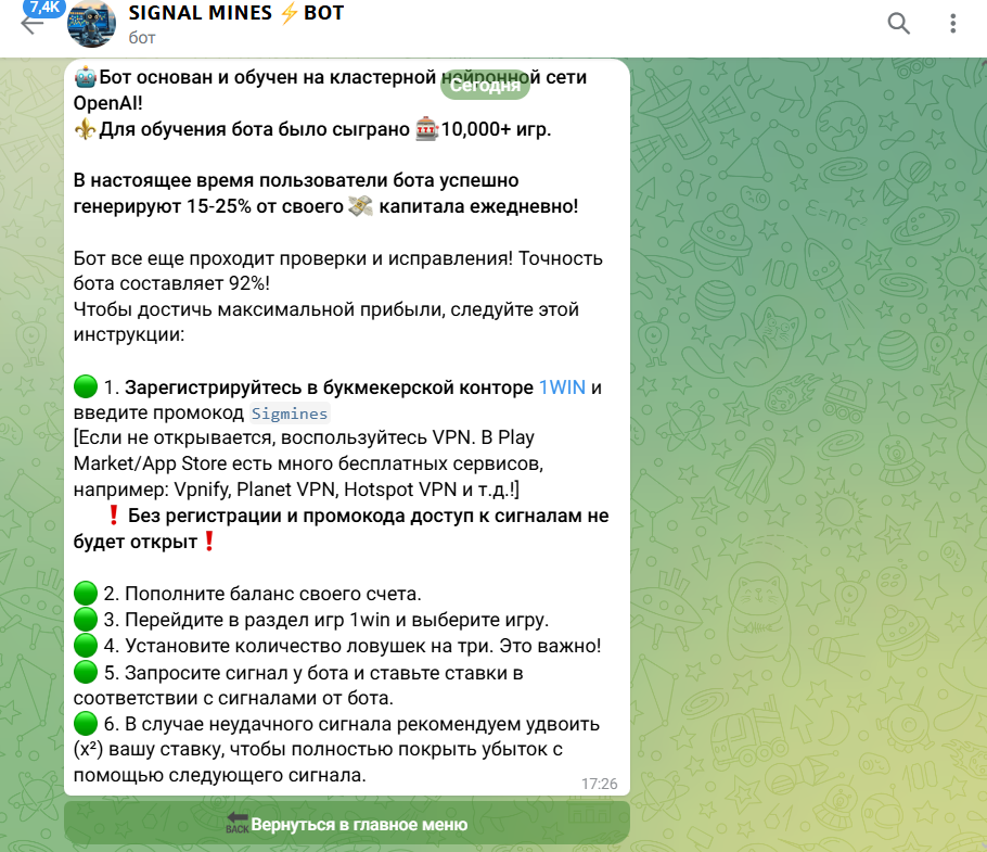 Signal Mines Bot — это Телеграмм-бот, который предлагает получать сигналы для игры “Мины” и других. По словам создателя, точность прогнозов робота составляет 92%, и с помощью приложения игроки уже получают от 15% ежедневной прибыли. В новой статье мы расскажем о проекте всю правду.