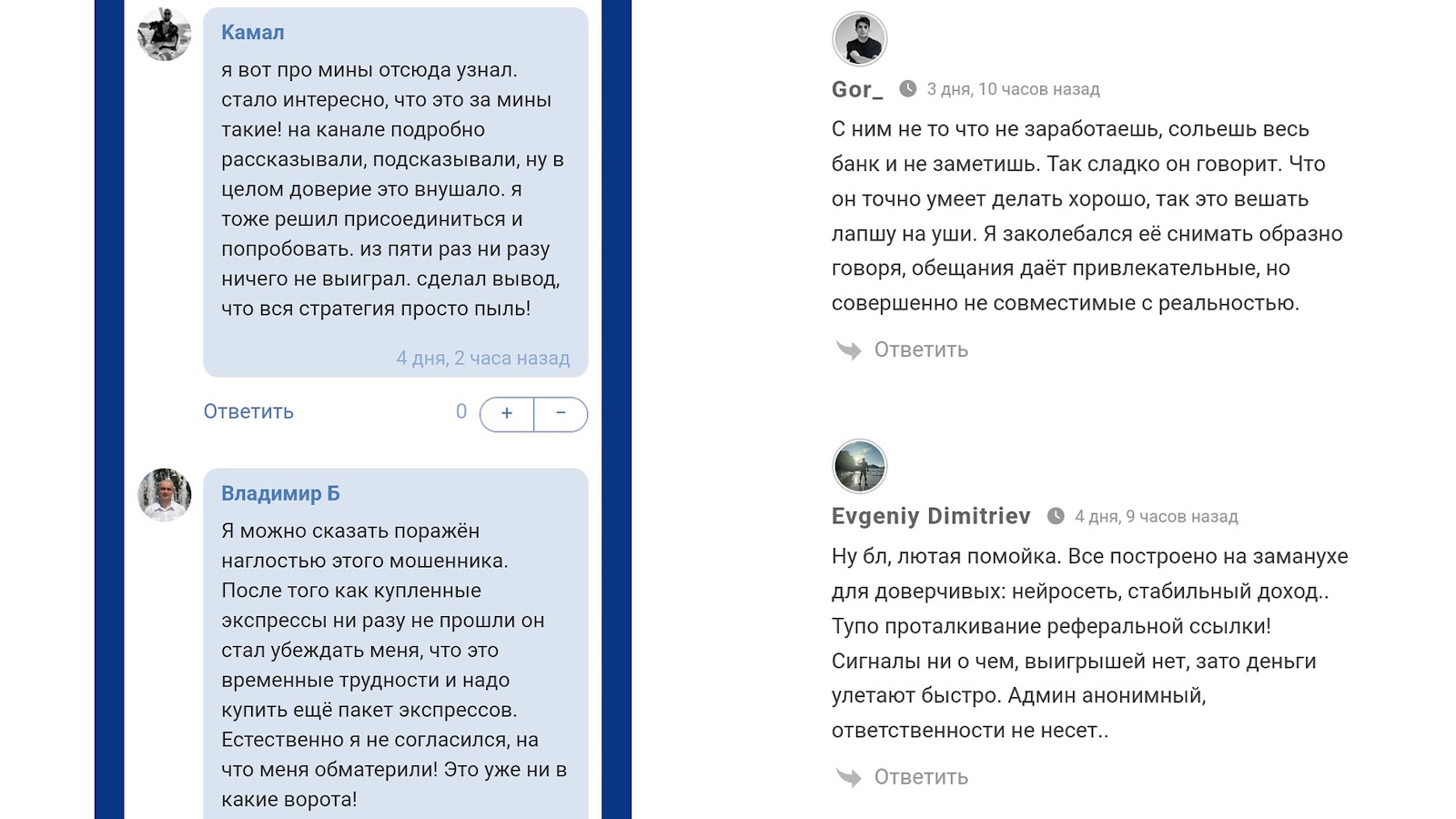 Оставлять комментарии в тг-канале запрещено, а чата для общения создатель не предоставил. На независимых ресурсах мы нашли отзывы о том, что основатель бота Signal Mines Bot разводит юзеров, так как его сигналы оказались нерабочими.