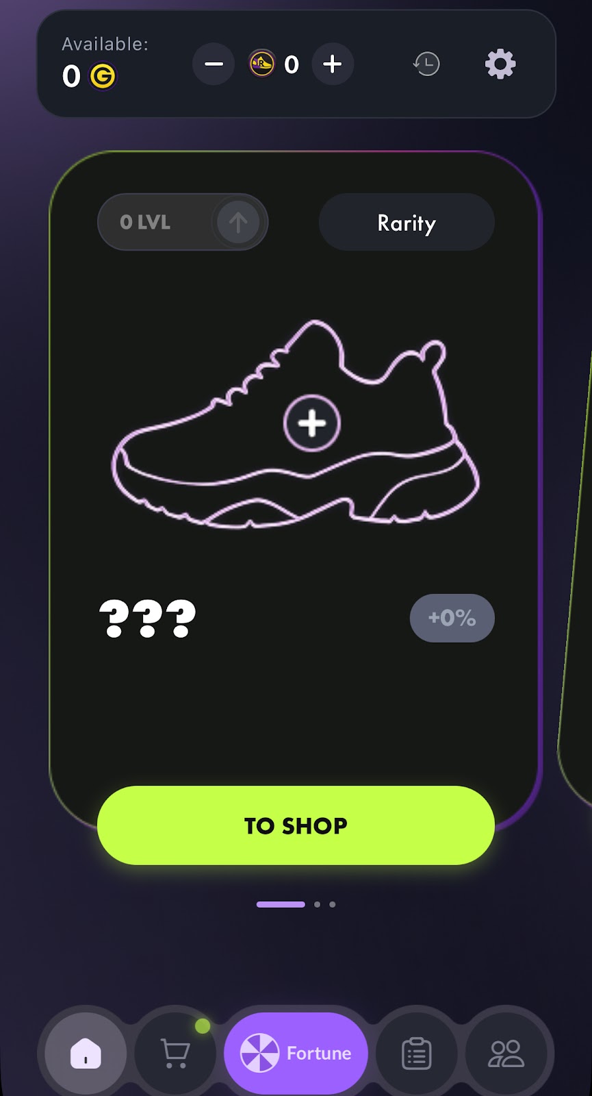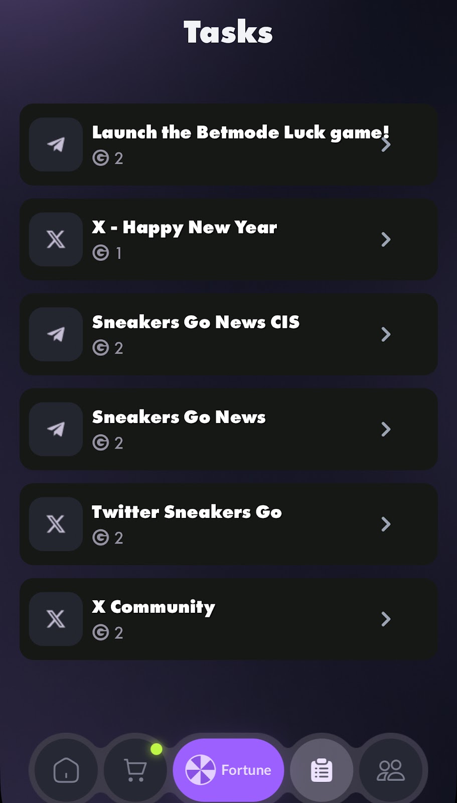 Платформа находится в мини-приложении telegram Sneakers go. На главном экране у юзеров есть табличка с заработанными монетами и присутствует возможность перейти в шоп для покупки кроссовок. Также в игре есть такие разделы как: «Главное меню», «Магазин», «Фортуна», «Задания», «Профиль».