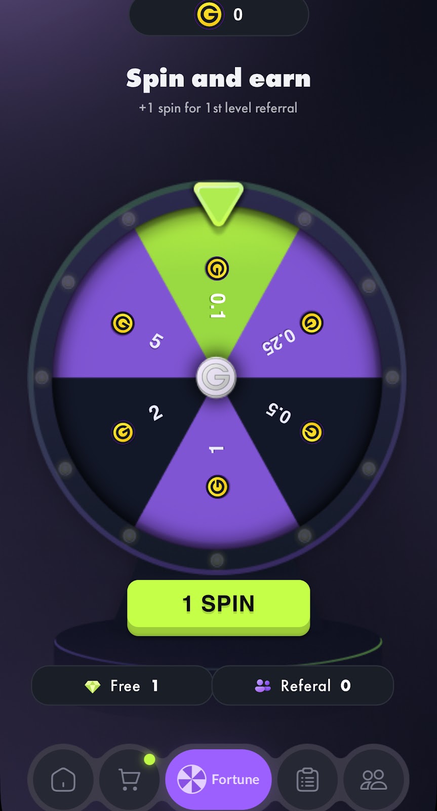В разделе колеса фортуны игроки «Сникерс го» могут испытать удачу и заработать от 0,25 до 5 внутренних монет. Ежедневно доступна одна бесплатная попытка, однако можно увеличить их количество, заплатив 1 кристалл — как его заработать остается неизвестным. Из этого раздела становится известно, что авторы предусматривают и реферальную программу. Скорее всего, за достижения друзей можно получать дополнительные шансы.