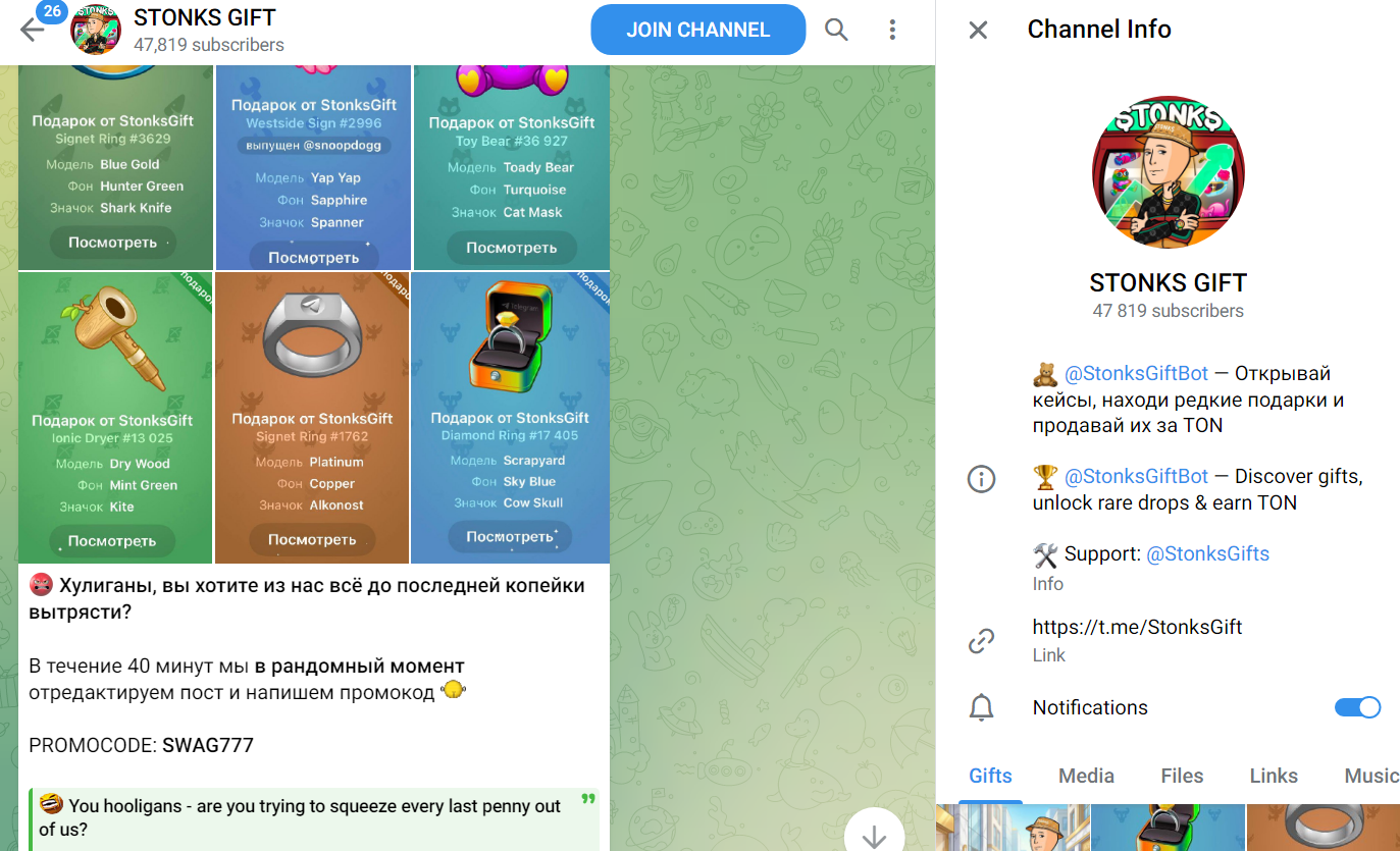 В тгк Stonksgift опубликованы рекомендации по получению гифтов, новые апгрейды в боте, новости о подарках. Помимо этого, админы делятся промокодами, а также сообщают о багах в сервисе. Новые посты появляются ежедневно. Страниц в других социальных сетях у проекта нет.