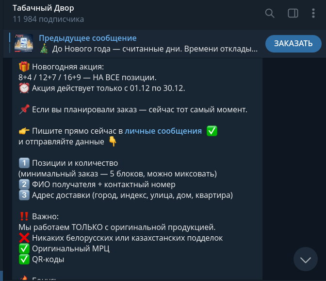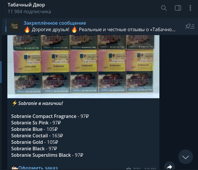«Табачный Двор» в Телеграм предлагает нам премиальные марки вроде Parliament, Sobranie или Marlboro по цене в районе 100 рублей за пачку (при покупке блоками). Любой, кто хоть немного знаком с экономикой и реалиями рынка, знает: настолько низких цен не бывает даже в крупном опте, не говоря уже о рознице.Легенда про «конфискат» или «таможенный сток» – старая сказка, которой кормят новичков еще со времен форумов нулевых. Обычно под таким соусом либо сливают откровенную подделку ужасного качества, либо, что вероятнее в нашем случае, просто собирают деньги.