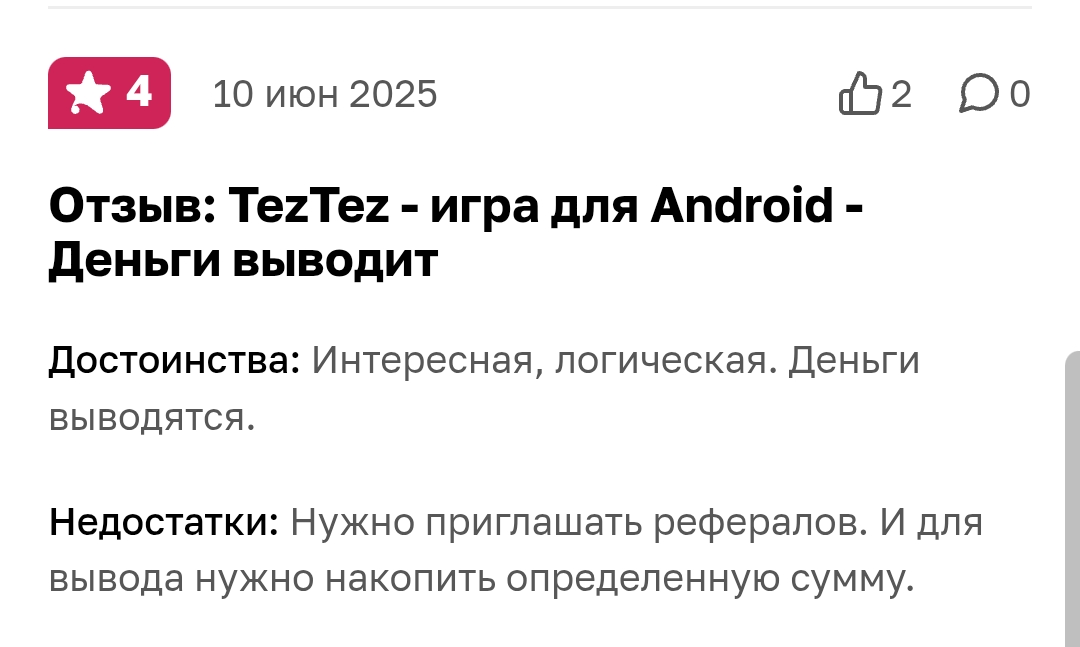 Приложение Tez Tez отзывы в Google Play и App Store получает в основном положительные. Её особенность в том, что здесь можно не только играть ради развлечения, но и пробовать зарабатывать деньги. В этом обзоре подробно разберём, как устроен геймплей TezTez, каким образом начисляются деньги, какие есть подводные камни и что о проекте говорят реальные пользователи. Также расскажем, как подключить кошелёк для выплат и вывести деньги.