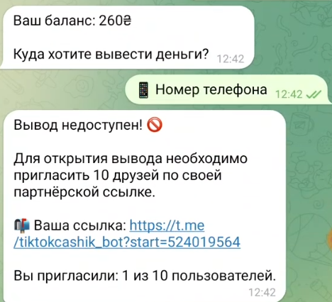 Как только дело доходит до получения выплаты появляются дополнительные условия – так часто делают мошенники. Для начала от нас требуют накопить минимальную сумму – 250 гривен, а затем внезапно нужно будет еще и пригласить 10 друзей. Очевидно, таким образом сервис пытается втянуть еще больше людей. Цель всего этого, возможно, выманивание важной информации: банковских реквизитов, номера телефона и т.д. – все это злоумышленники могут использовать в разных целях.