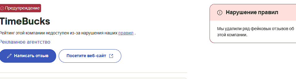 Множество фидбэков об этом сайте есть на TrustPilot – более 8 тысяч, но видеть рейтинг нельзя. Сервис «Тайм Бакс» нарушил правила «ТрастПайлот» тем, что размещал фейковые отзывы: