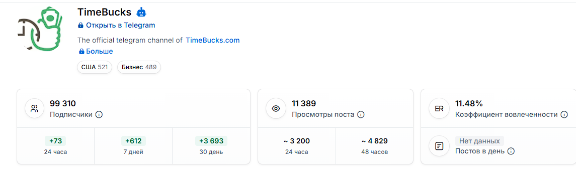 Статистика канала Time Bucks неплохая: виден стабильный прирост подписчиков и их высокая вовлеченность за последние сутки. Узнать данные за более длительный период нам не удалось: в TGSTat они не отображаются.