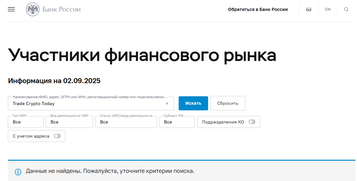 В интернете нет ни одного отзыва о Trade Crypto Today, ни одного комментария, ни одного обсуждения на форумах. Полный информационный вакуум. Такое отсутствие следов в сети – верный признак либо совсем нового, либо крайне сомнительного проекта.