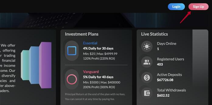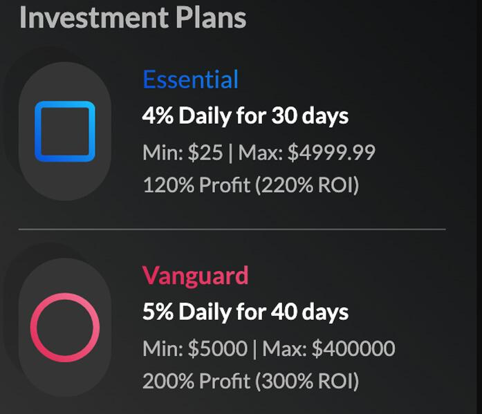 2. Vanguard предусматривает 5% в сутки в течение 40 дней при минимальном взносе $5000 и максимуме $400 000, с заявленной прибылью 200% и ROI на уровне 300%.