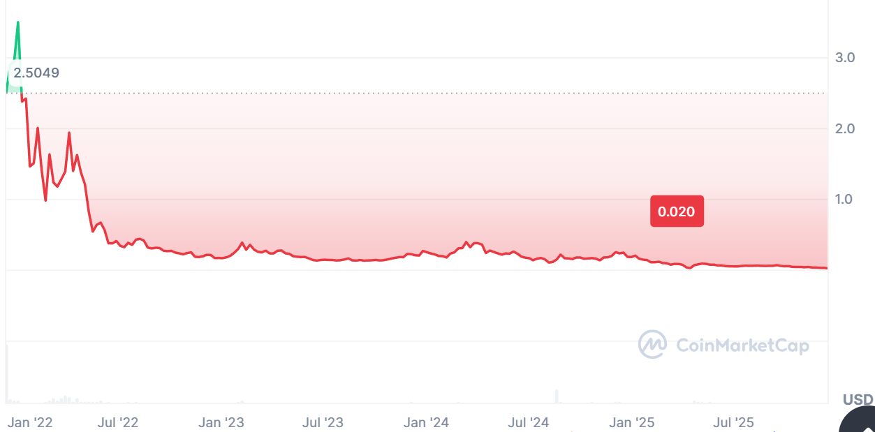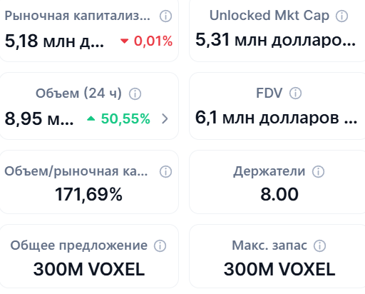 Курс монеты «Воксель» с момента ее появления практически постоянно падает. В январе 2022 году она кратковременно выросла в цене выше $3, но уже к декабрю упала ниже $1. В конце 2025 курс данного токена составляет всего $0,02. И перспектив для возврата к бычьему тренду пока нет.