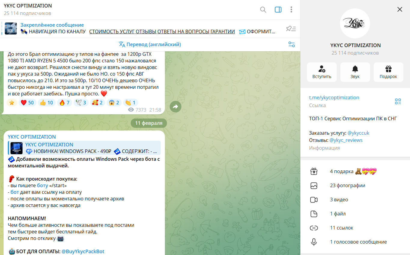 Телеграм-канал Ykyc Optimization появился в 2025 году. Точной даты создания в открытом доступе нет. Сейчас в ТГК около 25–30 тысяч подписчиков, посты выходят регулярно. Часто админы публикуют кейсы с «До и после», скриншоты FPS с экранов компьютеров пользователей и отзывы клиентов. Просмотры постов могут доходить до нескольких десятков тысяч, что говорит о заинтересованности аудитории. При этом реакций обычно оставляют меньше, чем можно ожидать при таком количестве подписчиков.
