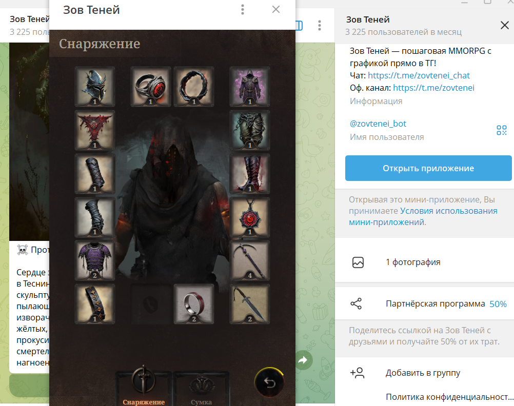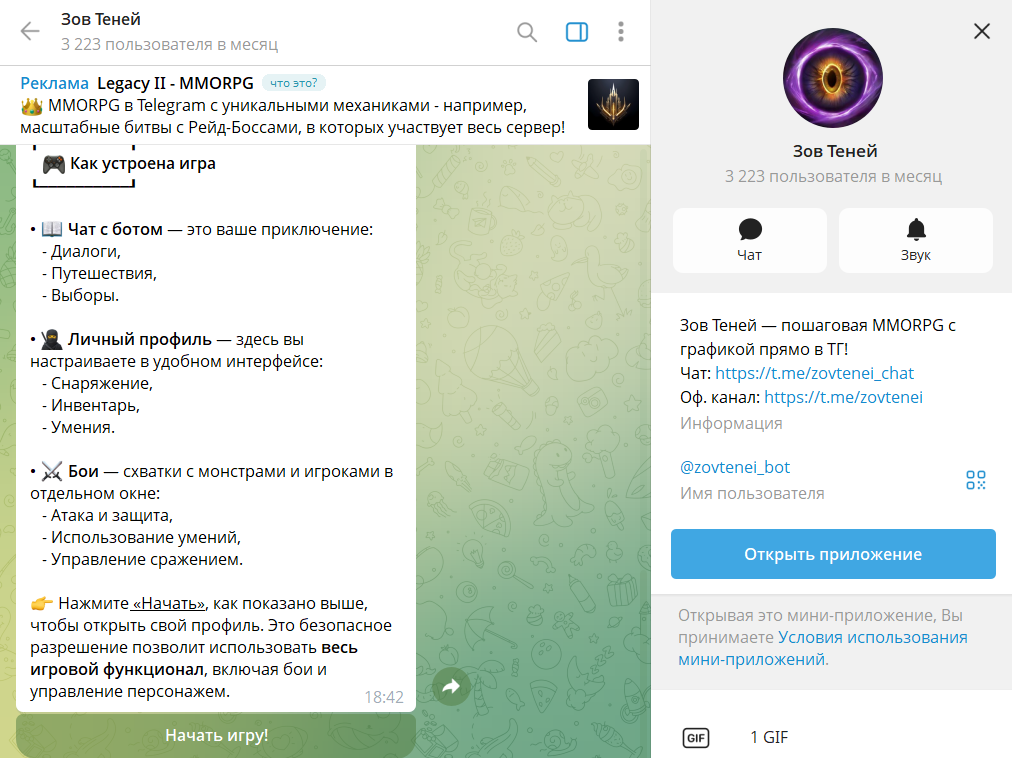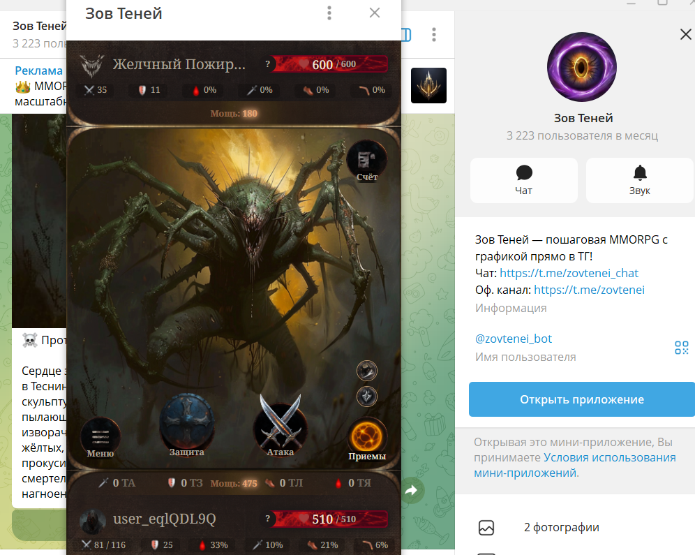 В «Зов Теней» играют прямо в Telegram, ведь сервис не требует скачиваний.