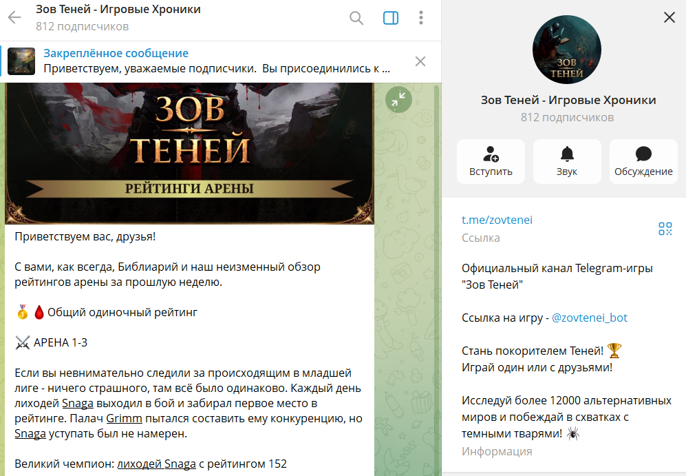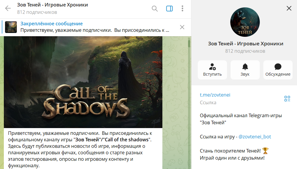 У проекта «Зов Теней» есть отдельный чат, где пользователи могут задавать вопросы и получать поддержку от разработчиков, а также следить за новостями, бонусами, апгрейдами и историями игроков.