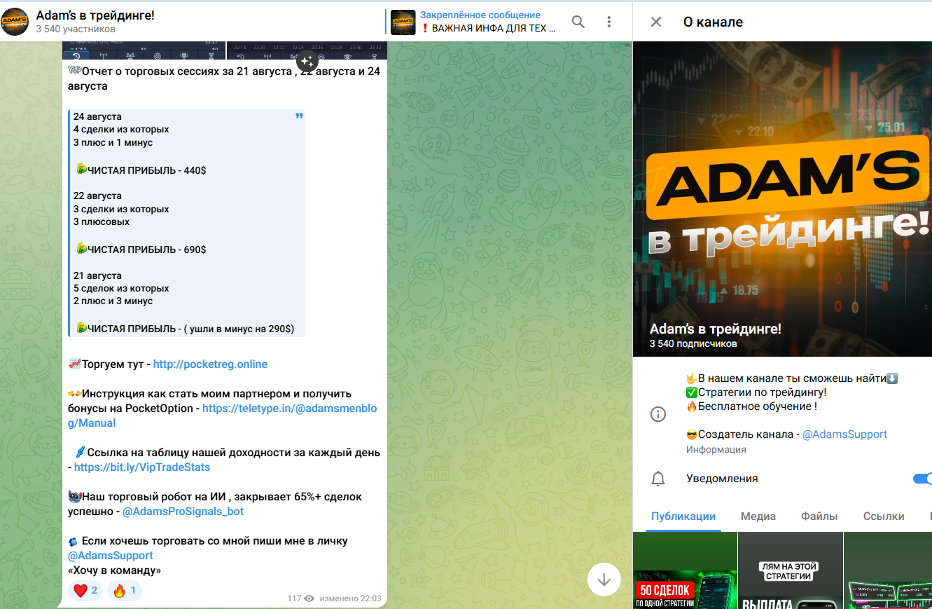 Общие сведения про создателя и Телеграмм канал Adams в Трейдинге