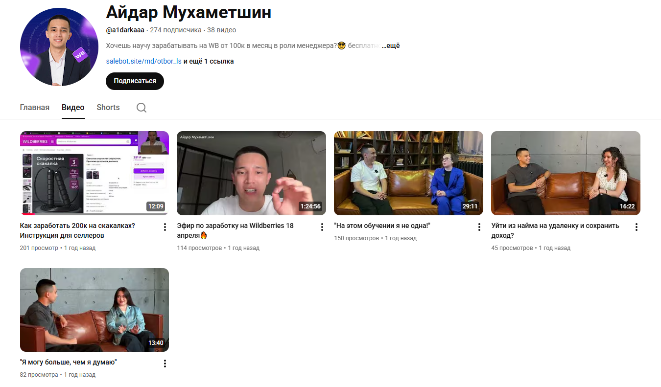 Все социальные сети Айдар Мухаметшин начал развивать только в 2024 году. Так на YouTube канале A1darkaa появились первые ролики о создании карточек на WB / подборе сферы и закупки нишевых товаров из Китая. Ранее он продавал свои курсы по этой сфере, но сейчас телеграм канал с материалами по заработку на WB переделан в обычную страницу для переадресации, что достаточно странно.