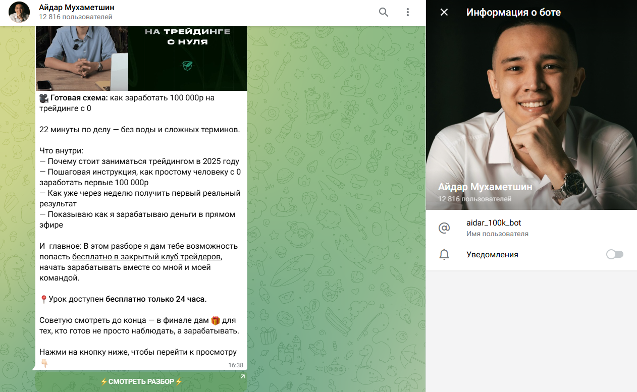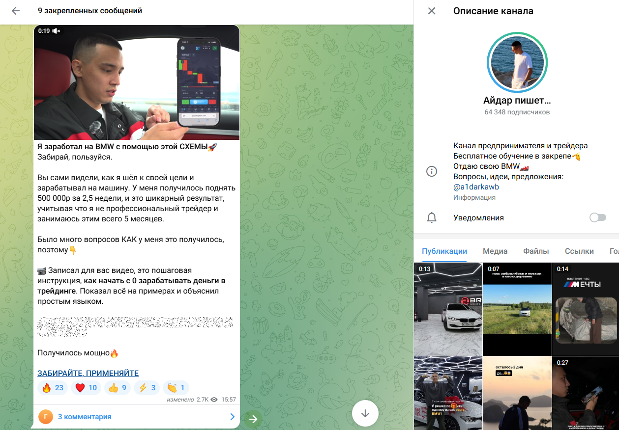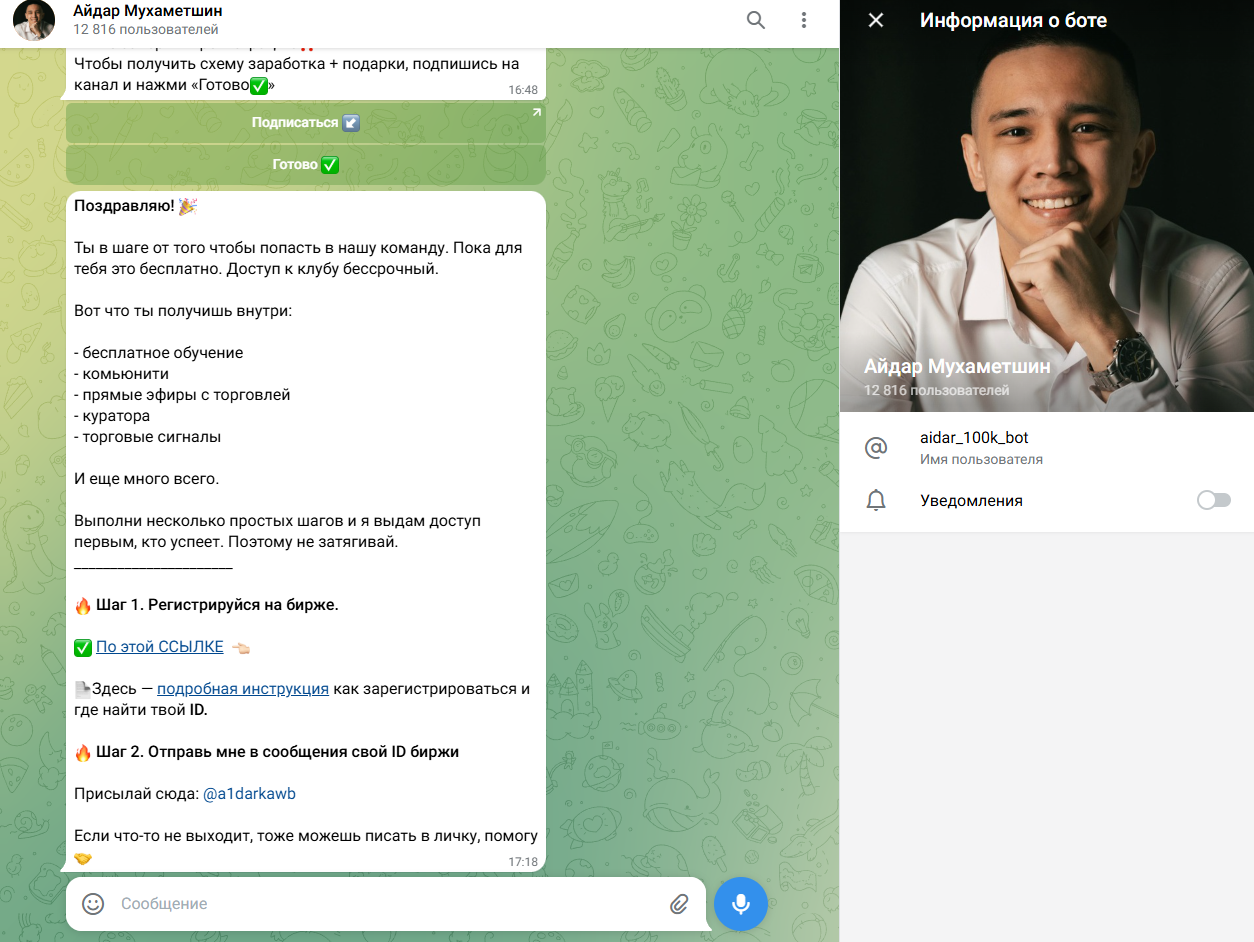 Сам Айдар вообще не имеет опыта в трейдинге и обычно это должно отталкивать подписчиков, но здесь различными психологическими приемами автор только привлекает аудиторию. Он играет роль блогера, который решил найти удаленную работу со свободными графиком и выбрал именно трейдинг. У него якобы есть опытные знакомые / кураторы, которые развиваются там более 5 лет и могут давать выгодные сигналы для заработка. Информация о них при этом не раскрывается.На фоне этого команда Айдара якобы решила создать приватное сообщество крипто инвесторов. Инфоцыгане и мошенники любят упоминать различные желания, типа собрать вокруг себя интересных / инициативных людей, чтобы расти вместе, однако это лишь пустые слова. Фактически Айдар Мухаметшин привлекает рефералов на Pocket Option, где заработок строится именно вокруг слива вашего депозита.