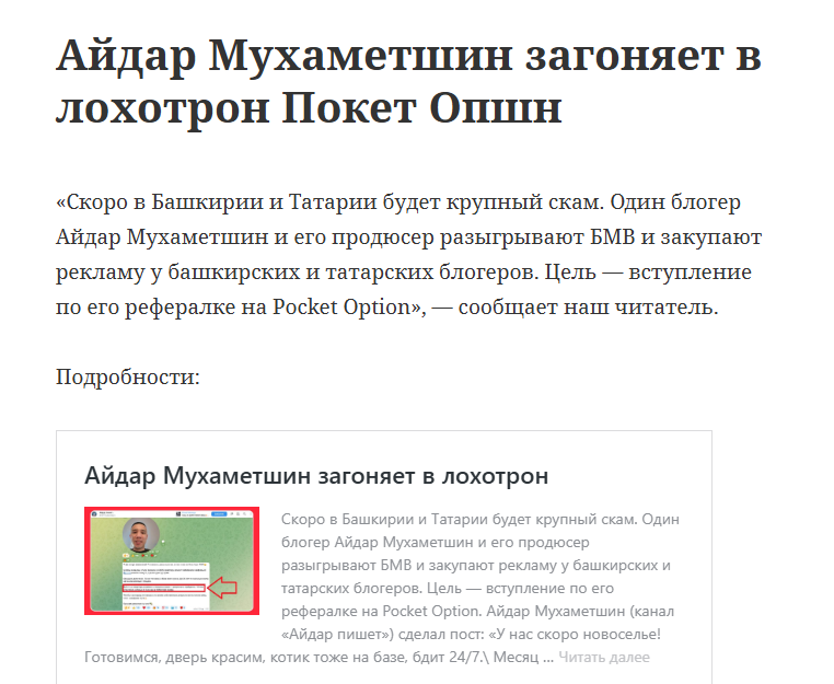 Из-за того, что инфо блоггер из Уфы, Айдар Мухаметшин, лишь недавно решил продвигать свою приватку по трейдингу, отзывов в интернете немного, но на тематических форумах уже появились жалобы обман, где автора называют мошенником из-за перегона аудитории в сомнительную биржу Pocket Option.