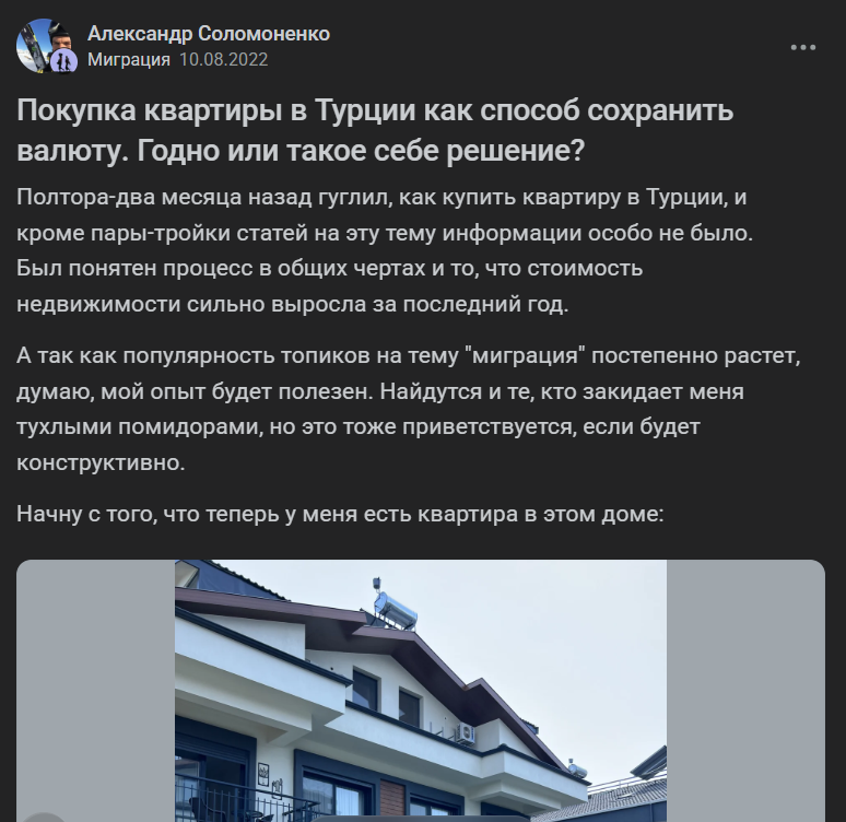 В одном посте Александр Соломоненко рассуждает о покупка квартиры в Турции как способ сохранить валюту. Дата публикации – 10.08.2022. Автор отмечает рост цен за последний год, дефицит подробных гайдов. Считает тему актуальной из-за популярности миграции и хочет помочь другим. Комментарий под постом 101.
