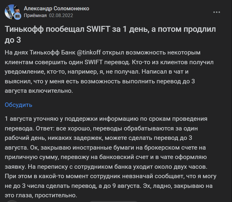 Второй пост автора называется «Тинькофф пообещал SWIFT за 1 день, а потом продлил до 3» за 02.08.2022. Комментариев всего девять, включая официальный ответ самого банка.